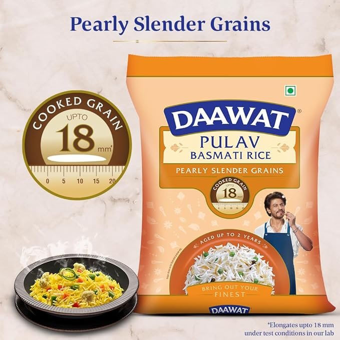 PREMIUM BASMATI QUALITY: Delight in the superior quality of Daawat Basmati Rice specifically curated for pulav, known for its long grains and aromatic essence that enhances the dish.