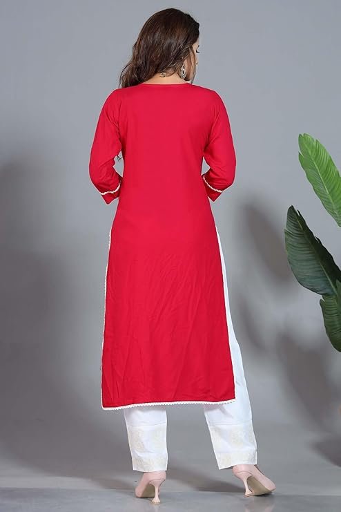Color : Red Colour || Style : Staight || Length : Calf Length || Embroidery : Floral Embroidery .