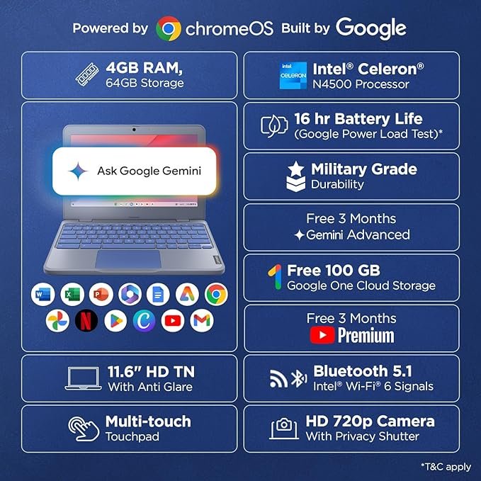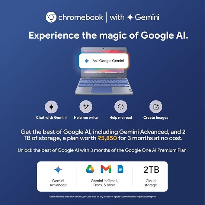 Lenovo {SmartChoice)Chromebook Intel Celeron N4500 (4GB RAM/64GB eMMC 5.1/11.6 Inch (29.46cm)/HD Display/2Wx2 Stereo Speakers/HD Camera/Chrome OS/Blue/1.21Kg), 82UY0014HA