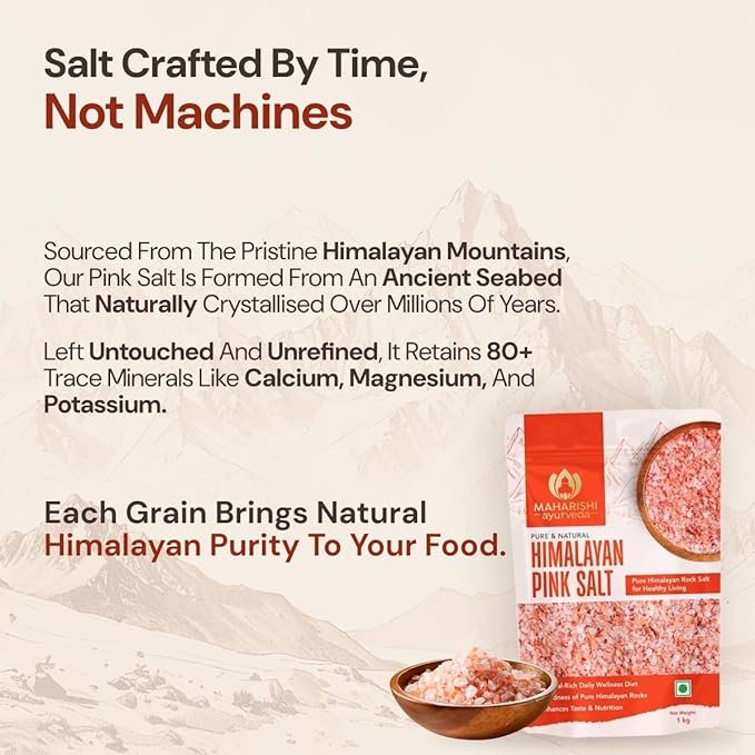 PACKAGE CONTENTS: 1 kg pack of premium Maharishi Ayurveda Himalayan Pink Salt, suitable for daily cooking and seasoning needs