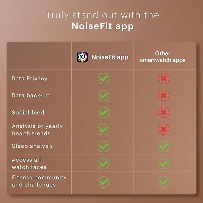 - NoiseFit app: Connect with the NoiseFit app where your health data and privacy are always protected. Unlock your peak potential by participating in challenges, track your progress, and keep pushing your limits with a community of fitness enthusiasts.