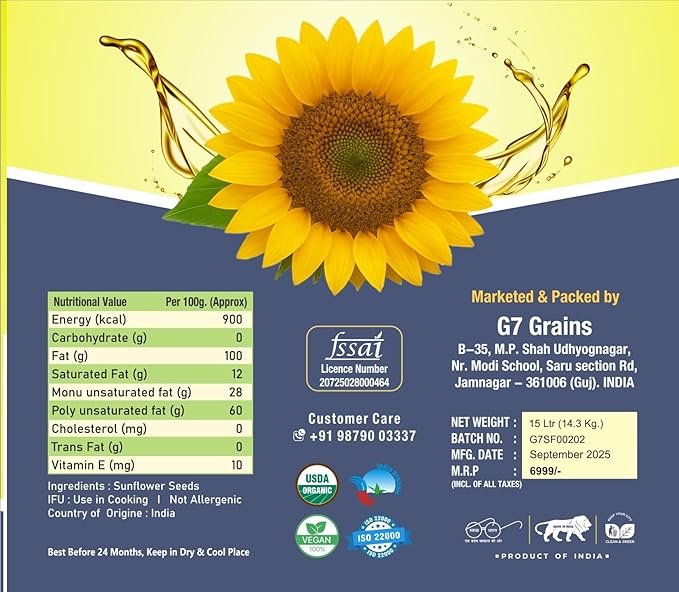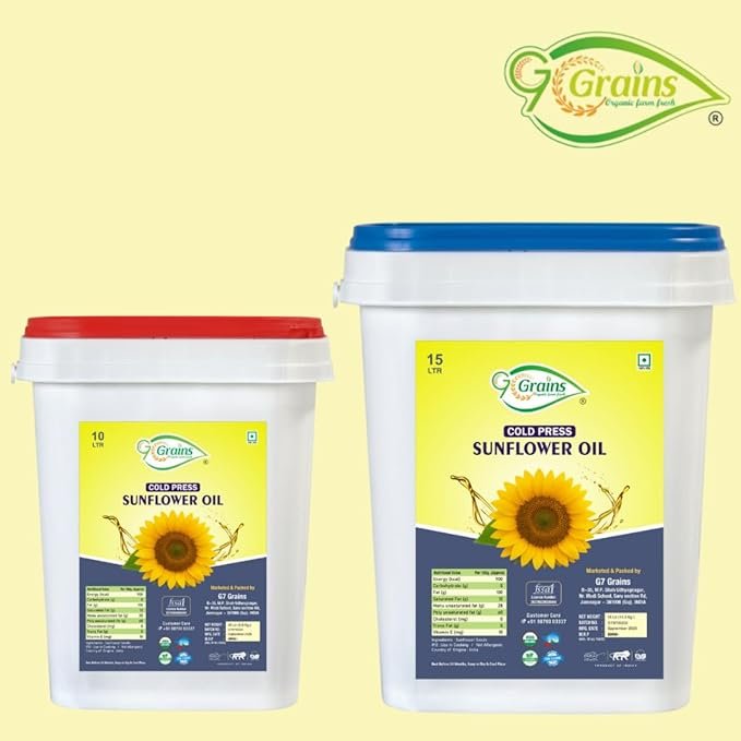 Organic Sunflower Oil (15 Ltr)|| Cold Pressed | Wood Pressed Sunflower Cooking Oil | Pure & Unrefined Kachi Ghani Ka Sudh Surajmukhi Ka Tel | Healthy & Nutritious | By G7 Grains